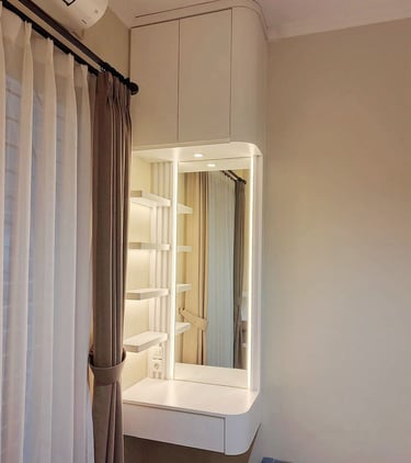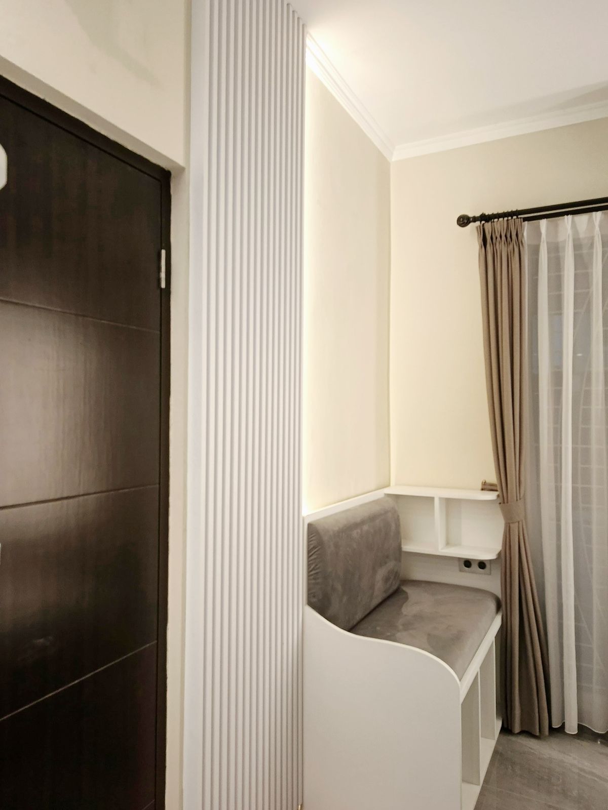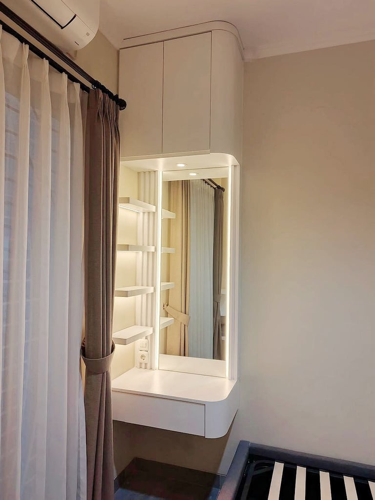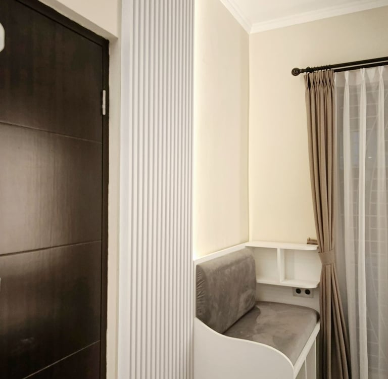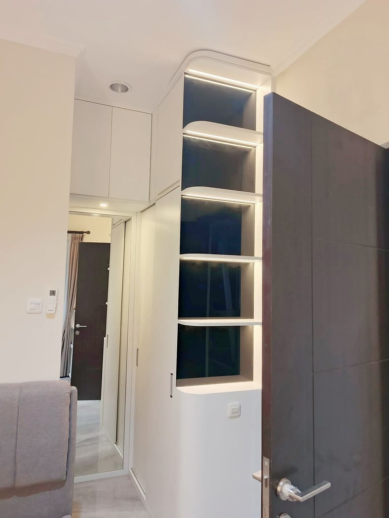 Interior panel bernuansa putih minimalis, menciptakan suasana kamar yang lebih luas, terang, dan menenangkan.