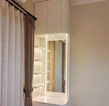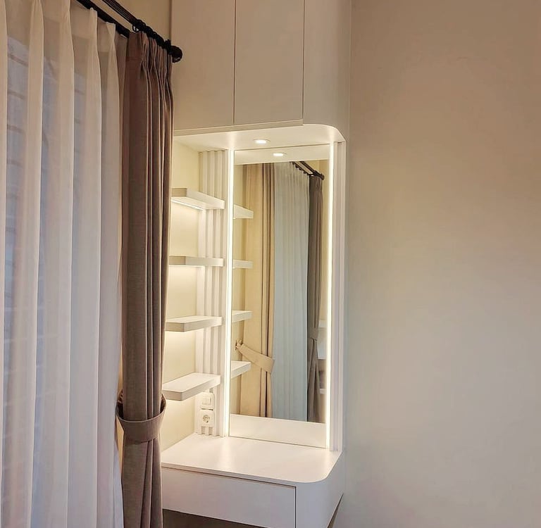 Wardrobe minimalis dengan penyimpanan fungsional.