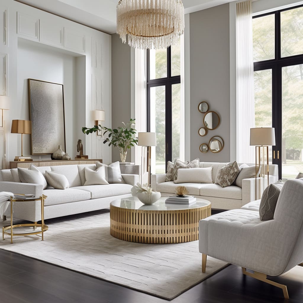 Palet warna elegan: krem, putih tulang, abu-abu muda, emas satin, dan aksen gelap eksklusif