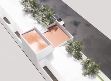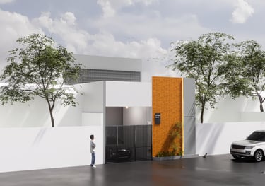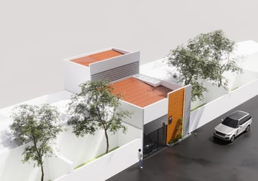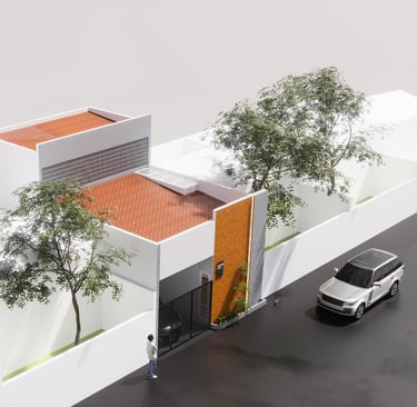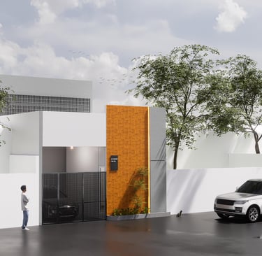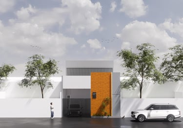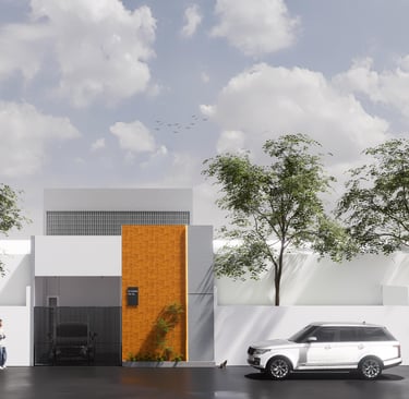 Tampilan fasad rumah dirancang dengan kombinasi dinding putih bersih, aksen bata ekspos berwarna oranye hangat, serta elemen abu-abu yang tegas. Perpaduan ini menciptakan kesan hangat, modern, sekaligus berkarakter. Pagar dengan pola sederhana menambah nilai estetis sekaligus menjaga privasi penghuni tanpa membuat rumah terasa tertutup.