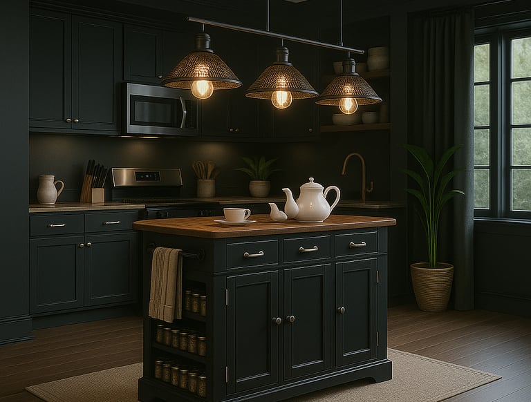 Pencahayaan juga menjadi elemen penting. Menggunakan lampu gantung model industrial mesh dengan tiga kap, ruangan mendapatkan cahaya hangat yang mempertegas tekstur kayu dan kilau cat hitam. Paduan ini membuat suasana dapur terasa lebih intim dan mengundang, cocok untuk momen memasak bersama keluarga atau sekadar menikmati kopi pagi.