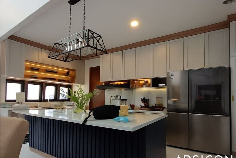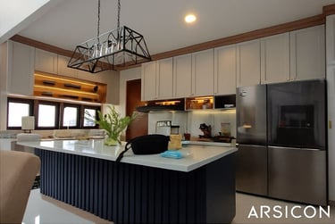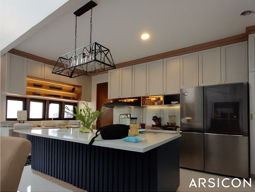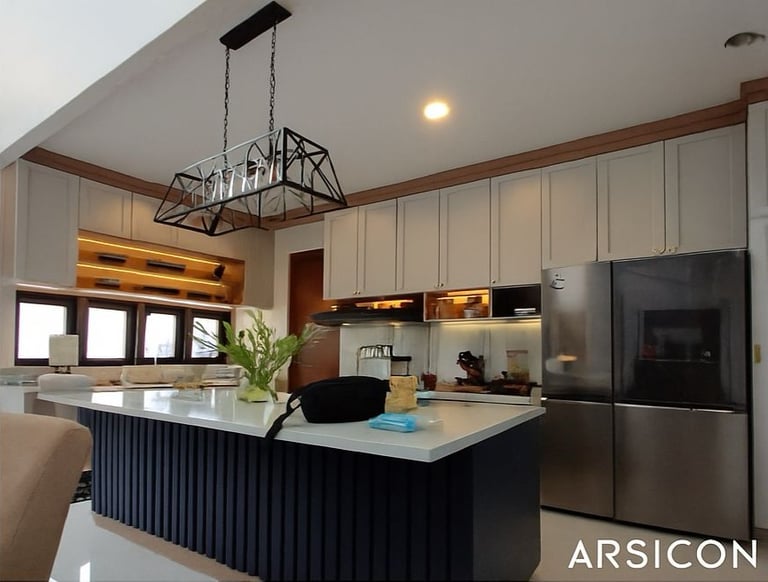 Pada proyek ini, Arsicon merancang island table bergaya modern minimalis dengan panel vertikal berwarna navy gelap yang berpadu harmonis dengan top table putih berbahan solid surface. Desainnya bersih, simpel, dan tanpa ornamen berlebihan, menghadirkan kesan luas dan rapi di dapur. Pencahayaan menggunakan lampu gantung dengan bentuk sederhana namun elegan, memperkuat nuansa minimalis yang hangat. Konsep ini cocok untuk hunian modern yang mengutamakan kepraktisan, estetika, dan kenyamanan visual.
