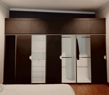 Desain sliding door yang ringkas menjadikan ruangan lebih efisien dan lapang. Fitur rak serta gantungan baju yang tertata simetris juga mendukung kerapian, sehingga setiap kebutuhan penyimpanan terorganisir dengan baik.