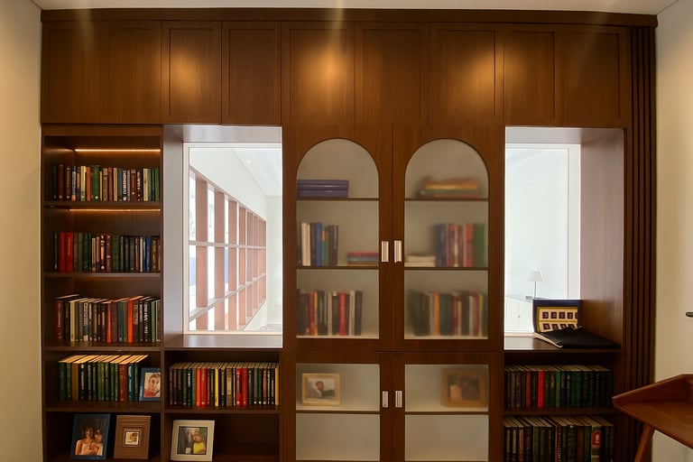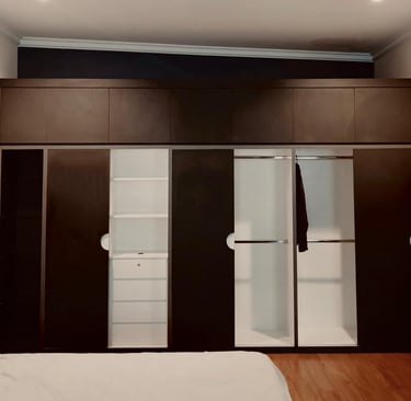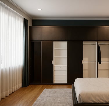 Wardrobe dengan sentuhan kayu elegan menampilkan perpaduan modern minimalis. Pintu kaca buram menghadirkan kesan eksklusif, sekaligus menjaga privasi isi lemari agar tetap rapi dipandang. Rak samping yang terbuka dapat digunakan untuk menata buku atau dekorasi personal, membuat kamar tidak hanya berfungsi sebagai tempat beristirahat, tetapi juga mencerminkan kepribadian pemiliknya.